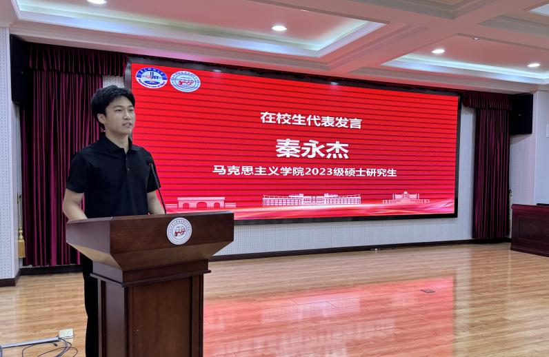 在校生代表、学院研究生会主席秦永杰结合自身成长经历分享感悟。他表示,研究生阶段是锤炼思想、深化专业、拓展视野的关键时期,鼓励大家珍惜时光、勤学善思、知行合一,积极投身理论研究和实践锻炼。