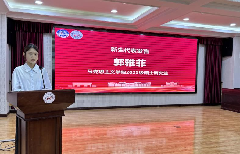 2025级新生郭雅菲代表全体新生向学院领导和老师们致以崇高敬意和衷心感谢,并表示全体新生将始终牢记校训院训,坚定马克思主义信仰,夯实理论根基,勇担时代使命,奋力书写无愧于时代、无愧于人民的青春篇章。