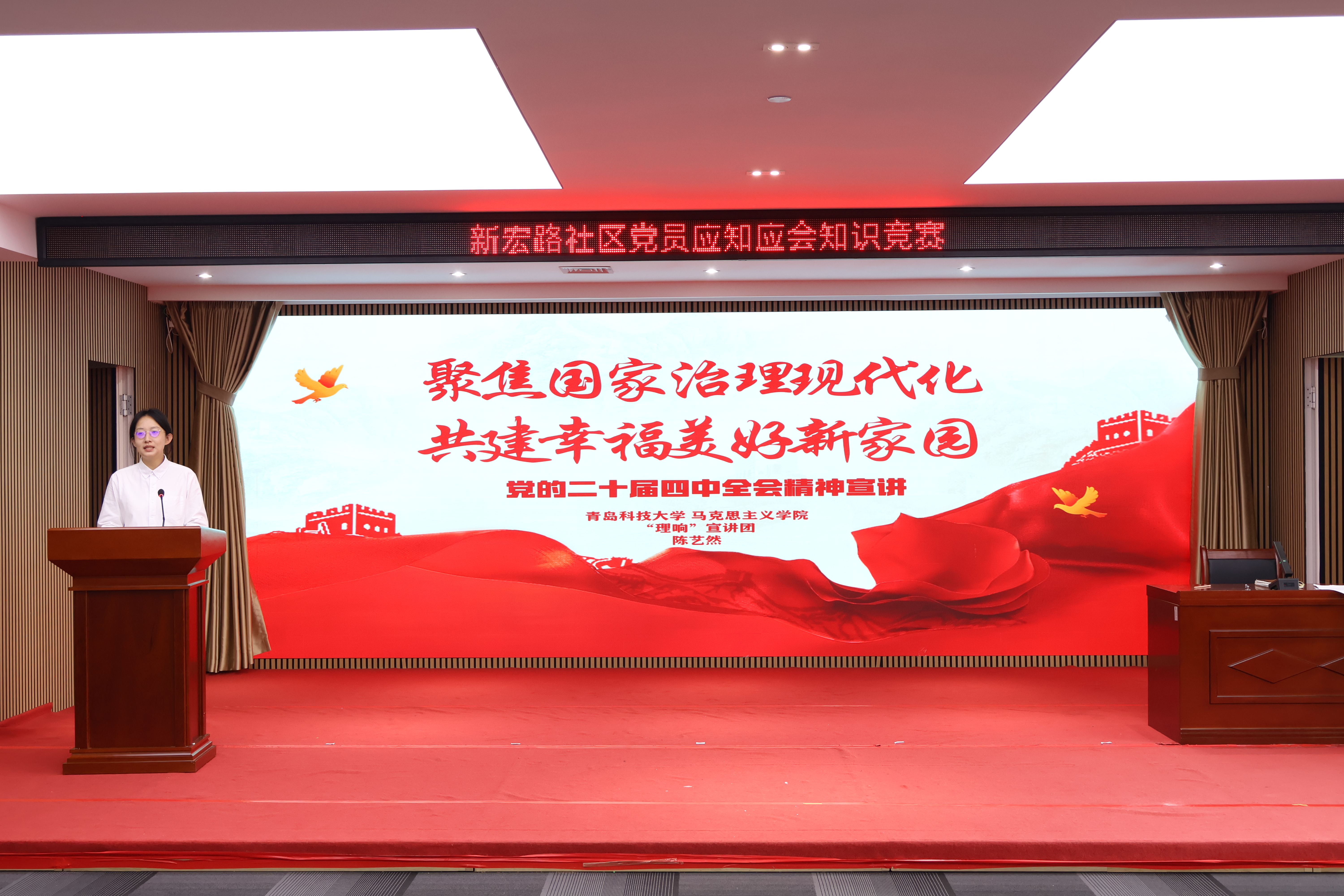 邹琪以《擘画“十五五”新蓝图 续写中国式现代化新篇章》为题,系统解读了党的二十届四中全会精神与“十五五”规划蓝图。她从“五年规划”的由来与意义出发,回顾了“十四五”时期我国取得的显著成就,明确了“十五五”承前启后的关键定位,号召全社会凝心聚力,将宏伟蓝图转化为可感可知的民生实效。陈艺然以《聚焦国家治理现代化共建幸福美好新家园》为题,结合社区“多网合一”治理、“一站式”服务等生动实例,阐释了国家治理现代化的深刻内涵。她强调要筑牢党的领导、人民当家作主、民主法治等制度根基,呼吁居民以关心、参与、担当和信任,共同建设幸福美好的家园。