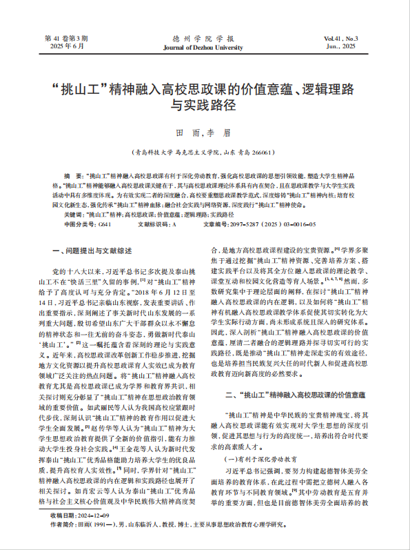 《德州学院学报》:“挑山工”精神融入高校思政课的价值意蕴、逻辑理路与实践路径