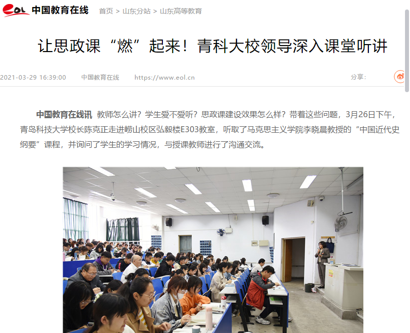校领导深入课堂听思政课,是青科大贯彻落实习近平总书记在学校思想政治理论课教师座谈会上的重要讲话精神、加强思想政治理论课建设的一项具体举措,对鼓励思政课教师不断提高自身业务素质和教学水平、引导学生学好思想政治理论课程具有积极推动作用。