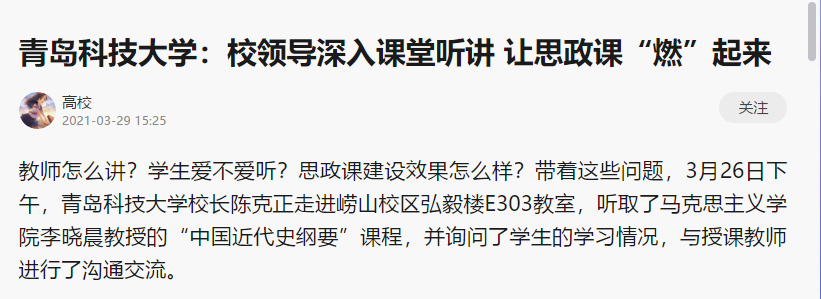 近期,多家媒体报道了青岛科技大学构建机制健全完善、主体广泛多元、力量有效联结的新发展阶段思政工作新格局,倾力打造一批真正入脑入心入耳的思政金课。