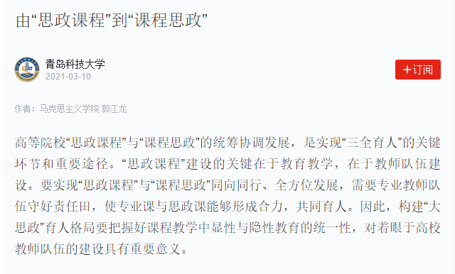 高等院校“思政课程”与“课程思政”的统筹协调发展,是实现“三全育人”的关键环节和重要途径。“思政课程”建设的关键在于教育教学,在于教师队伍建设。要实现“思政课程”与“课程思政”同向同行、全方位发展,需要专业教师队伍守好责任田,使专业课与思政课能够形成合力,共同育人。因此,构建“大思政”育人格局要把握好课程教学中显性与隐性教育的统一性,对着眼于高校教师队伍的建设具有重要意义。