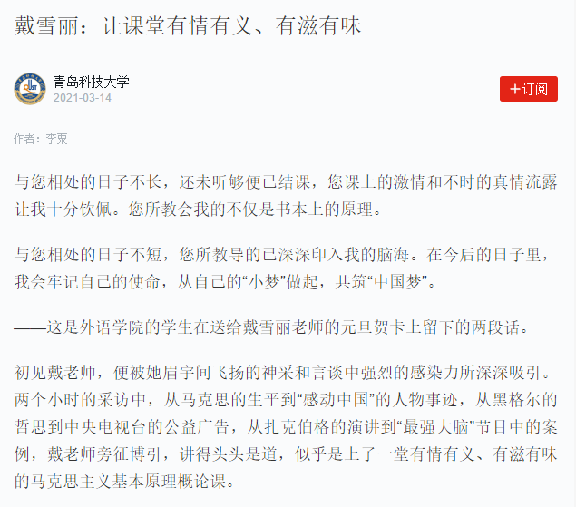 戴老师不仅受到学生的爱戴,在教学上也成果丰硕。近几年,她曾获教育部在线教育中心“2018年度智慧教学之星”荣誉称号,山东省高校青年教师教学竞赛三等奖、思政课教师教学竞赛二等奖,学校青年教师教学竞赛一等奖、信息化教学竞赛一等奖。