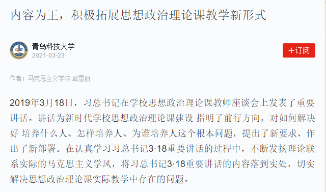 2019年3月18日,习近平总书记在学校思想政治理论课教师座谈会上发表了重要讲话。讲话为新时代学校思想政治理论课建设 指明了前行方向,对如何解决好培养什么人、怎样培养人、为谁培养人这个根本问题,提出了新要求、作出了新部署。在认真学习习近平总书记3·18重要讲话的过程中,不断发扬理论联系实际的马克思主义学风,将习近平总书记3·18重要讲话的内容落到实处,切实解决思想政治理论课实际教学中存在的问题。