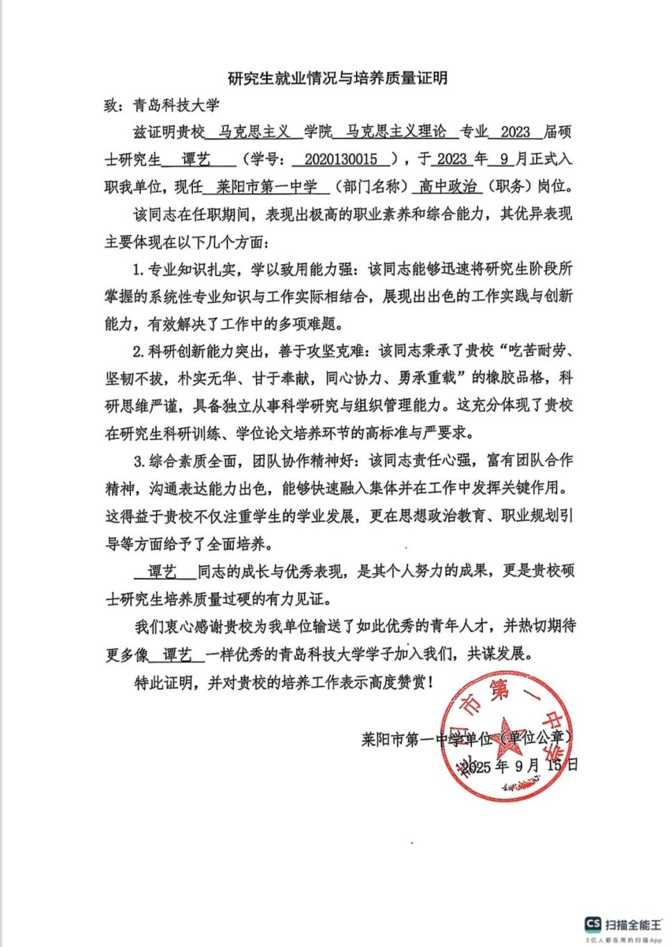2023届hjc黄金城网站硕士毕业生谭艺入职莱阳市第一中学思政课教师岗位