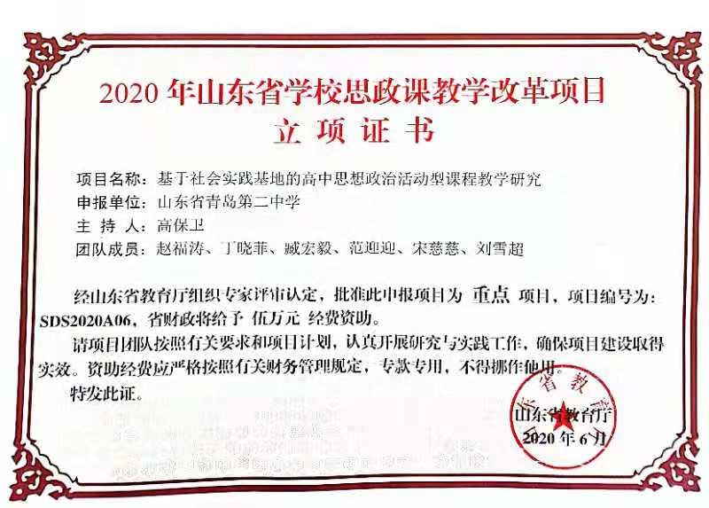 2020年山东省学校思政课教学改革项目:《基于社会实践基地的高中思想政治活动型课程教学研究》