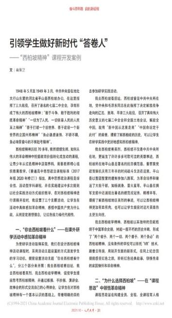人民教育202110:《引领学生做好新时代“答卷人”——“西柏坡精神”课程开发案例》,中文核心期刊